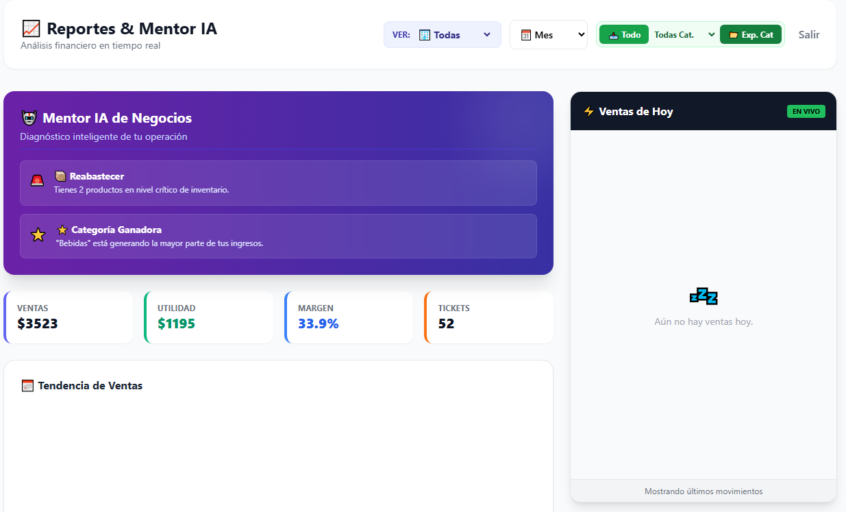 Una vista panorámica de tus ventas, productos más vendidos, alertas de stock y rendimiento de cajeros.